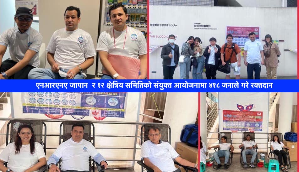 टोकियो । गैरआवासीय नेपाली संघ (एनआरएनए) जापान र १२ क्षेत्रिय समितिहरूको संयुक्त आयोजनामा जापानको प्रमुख शहरहरू र नेपालको काठमाण्डौ एनआरएनएको केन्द्रिय कार्यालयमा एकै समय एउटै ब्यानरमा ४१८ जनाले रक्तदान गरी यस कार्यक्रम सम्पन्न भएको छ ।