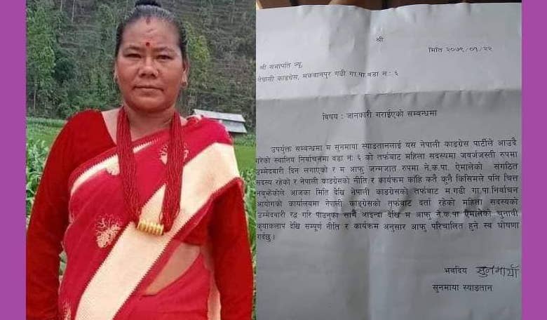 हेटौडा । मकवानपुरको मकवानपुरगढी– ६ की महिला सदस्य उम्मेदवार सुनमाया स्याङ्तानले आफूले कांग्रेसले जबरजस्ती उम्मेदवार उठाएको भन्दै उम्मेदवारी रद्द गर्न माग गरेकी छन् । उनले एक विज्ञप्ति जारी गर्दै उम्मेदवारी रद्द गरिदिन आग्रह गरेकी हुन् ।