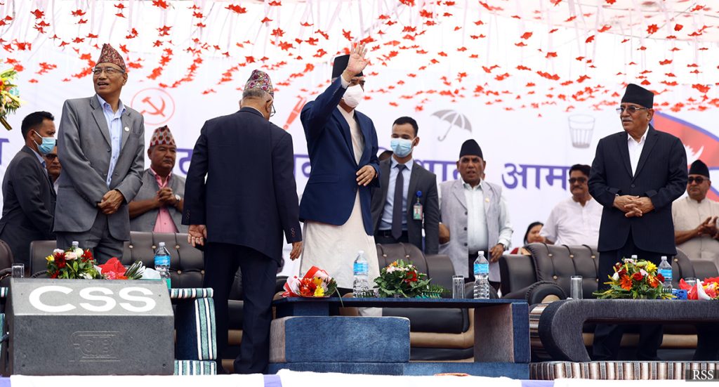 आज नै देउवा, माओवादी केन्द्रका अध्यक्ष पुष्पकमल दाहाल प्रचण्ड, एकीकृत समाजवादीका अध्यक्ष माधवकुमार नेपाललगायतले सत्ता गठबन्धनले चितवनको भतरपुरमा आयोजित संयुक्त सभालाई सम्बोधन गर्दै छन् ।