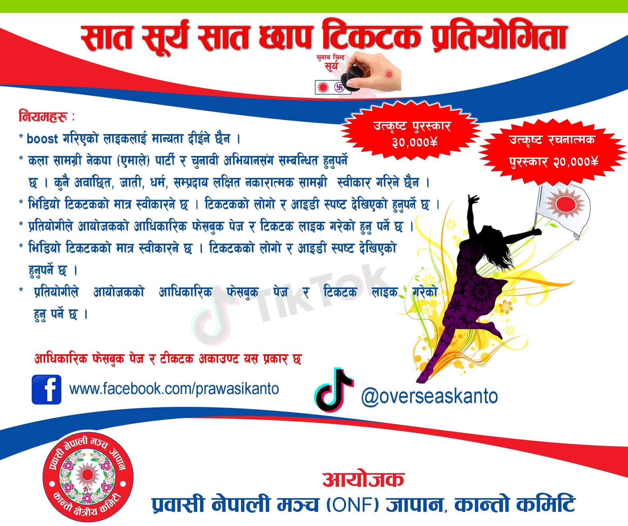 * प्रतियोगीले आयोजकको आधिकारिक फ़ेसबुक पेज र टिकटक लाइक गरेको हुनु पर्ने छ ।