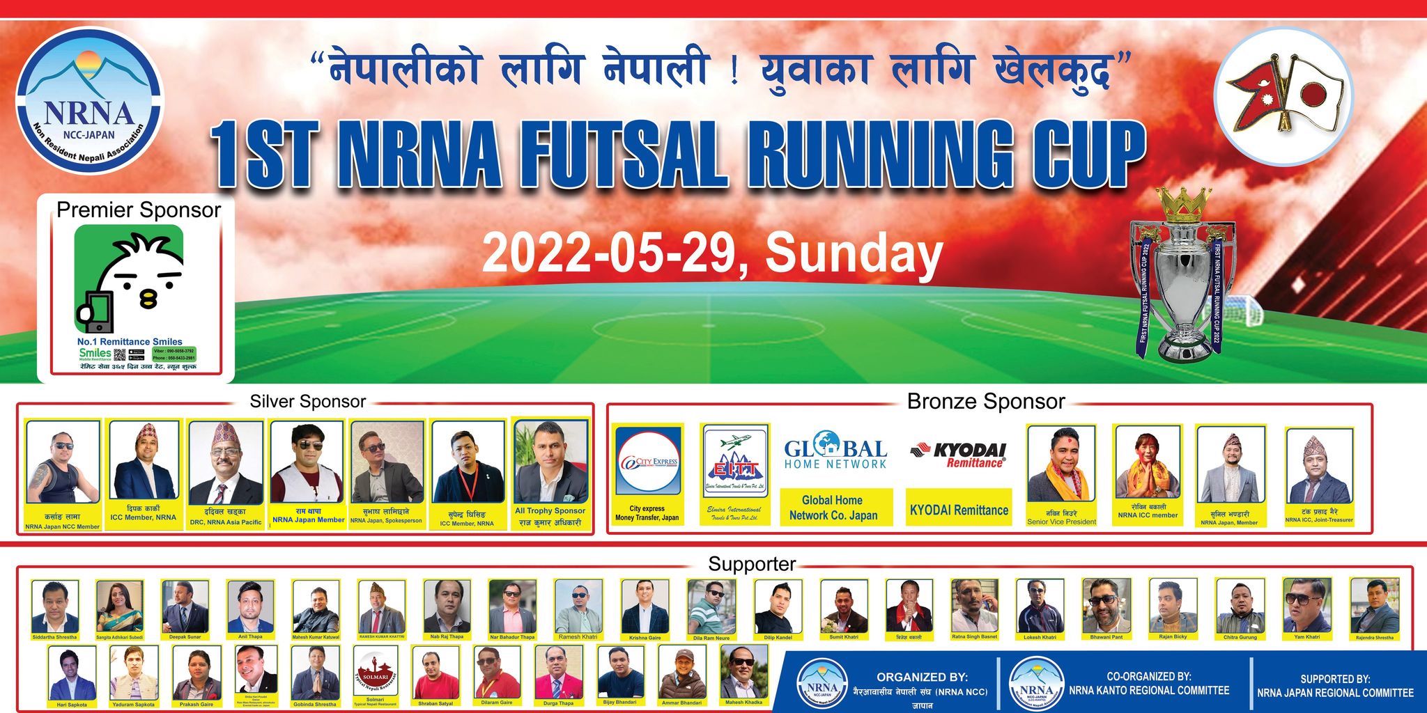 एनआरएनए जापान स्थापना भए देखी फुट्सल प्रतियोगिता भएको यो पहिलो पटक रहेको हुँदा कार्यक्रमलाई बिभिन्न माध्यमबाट सहयोग गर्नु हुने स्पोन्सर, खेलाडी तथा खेल प्रेमीहरुलाई फुटसल खेलमा उपस्थित भई हौसल्ला गराईदिनु हुन एनआरएनए जापानका महासचिव सिद्धार्थ श्रेष्ठले अनुरोध गर्नु भयो ।