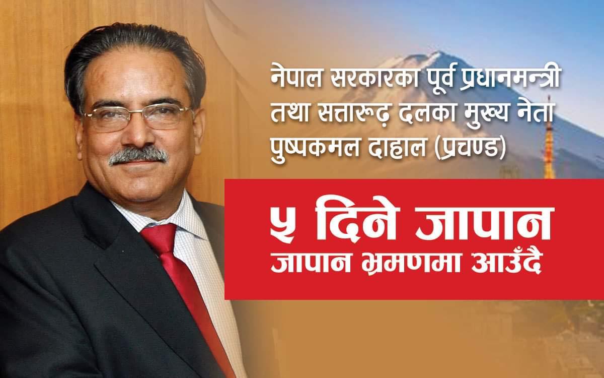 जापान । नेपाल सरकारका पूर्व प्रधानमन्त्री, नेकपा माओवादी केन्द्र का अध्यक्ष तथा सत्तारुढ दलका एक प्रमुख नेता पुष्पकमल दाहाल प्रचण्ड ५ दिने भ्रमणको लागि अगस्ट ६ तारिख जापान आउने भएका छन ।