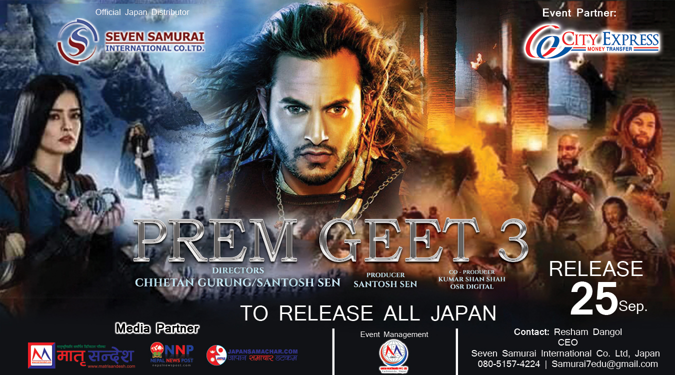 जापान । बहुचर्चित नेपाली कथानक चलचित्र ‘प्रेम गीत ३’ को सेप्टेम्वर २५ तारिखबाट जापानभर प्रदर्शन हुने भएको छ । ‘प्रेम गीत’ र ‘प्रेम गीत २’ बक्स अफिसमा सफल भई अधिकतम चर्चामा आएको प्रेम गीत ३ जापानमा पनि रिलिज हुने भएको हो ।
