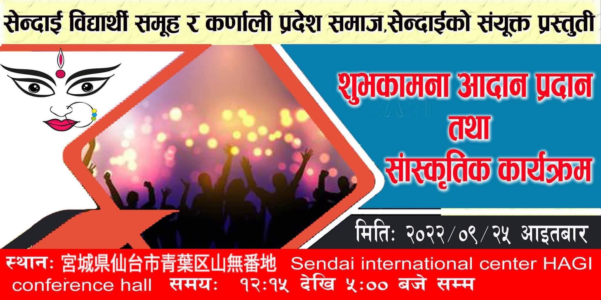 नेपालीहरूको महान पर्वको अवसर पारेर प्रवासमा पनि आफ़नो कला संस्कृति, रितिरिवाज र चाडपर्वलाई बचाई राख्ने उद्देश्यले जापानका लागी नेपाली राजदूत महामहिम डाक्टर दुर्गा बहादुर सुबेदीको प्रमुख आतिथ्यमा सेप्टेम्बर २५ तारिकका दिन सो कार्यक्रम गर्न लागिएको सेन्दाई विद्यार्थी समूहका अध्यक्ष गोकर्ण रूपाखेतीले जानकारी दिए ।