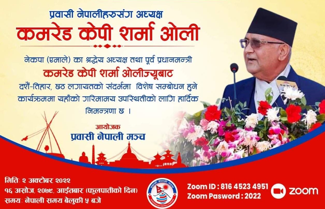 प्रवासी नेपाली मञ्चको आयोजनामा विजयी दशमीको अवसरमा अक्टोबर २ तारिख अर्थात् असोज १६ गते फुलपातीको दिन अध्यक्ष ओलीले जुममार्फत प्रवासी नेपालीहरुलाई सम्बोधन गर्ने कार्यक्रम तय भएको मञ्चका अध्यक्ष भक्त गुरूङले जानकारी दिनुभयो ।