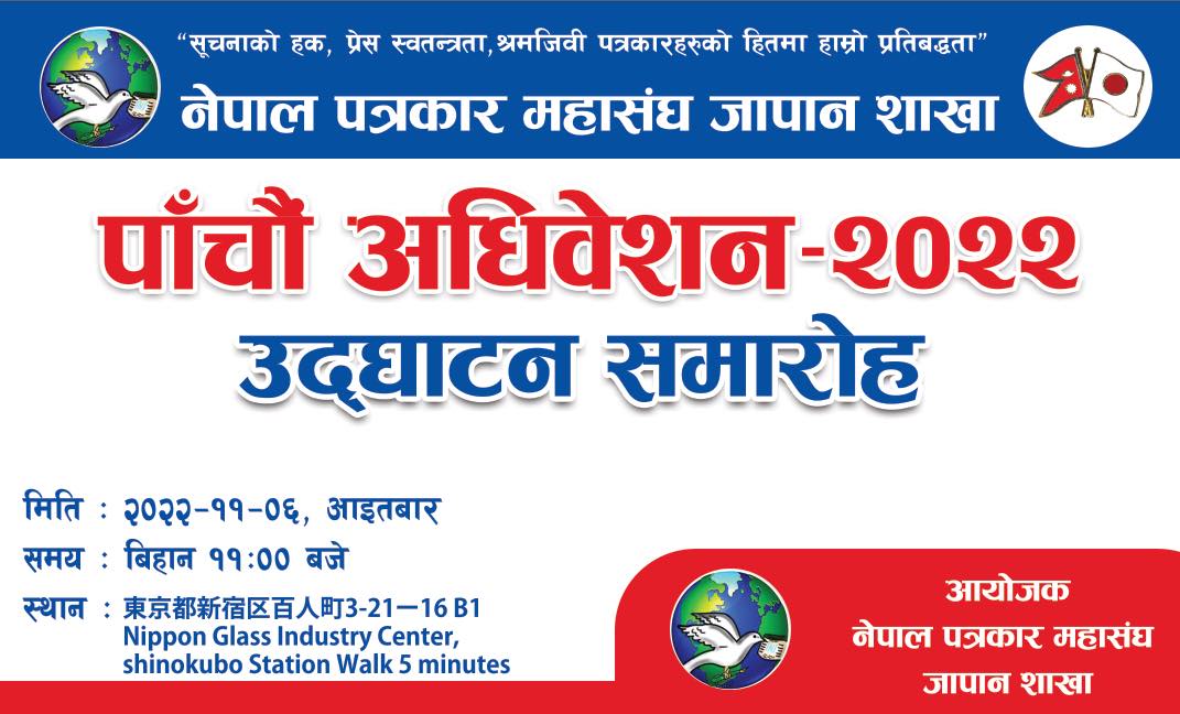 नेपाल पत्रकार महासंघ जापान शाखाको ५औं अधिवेशन २०२२ नोभेम्बर ६ तारिख बैठकले निर्णय गरेको छ ।
