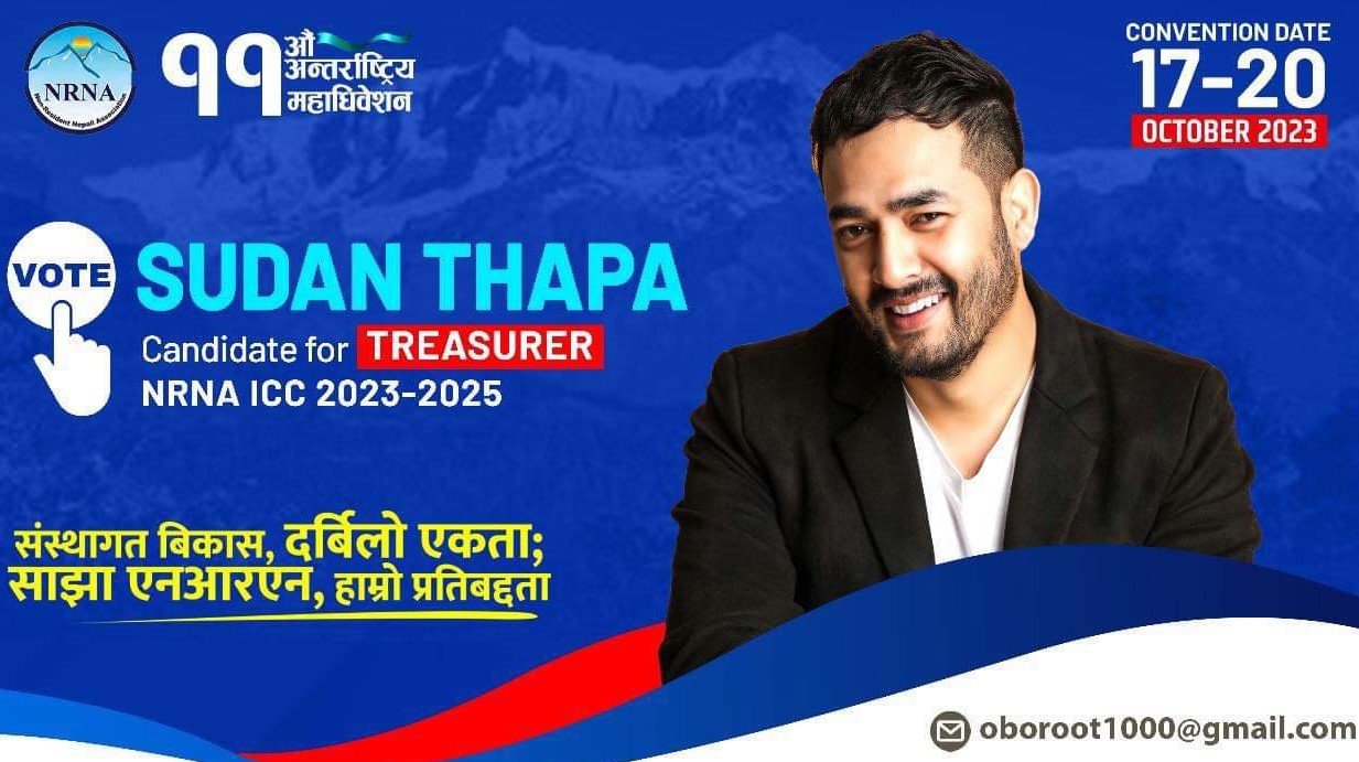 जापान । गैरआवासीय नेपाली संघ एनआरएनए कोषाध्यक्ष पदमा जापानबाट युवा व्यवसायी सुदन थापाले उम्मेदवारी घोषणा गरेका छन् । एनआरएनए आईसीसीको आगामी कार्यकाल २०२३-०२५ का लागि कोषाध्यक्ष पदमा थापाले उम्मेदवारी दिने घोषणा गरेका हुन ।