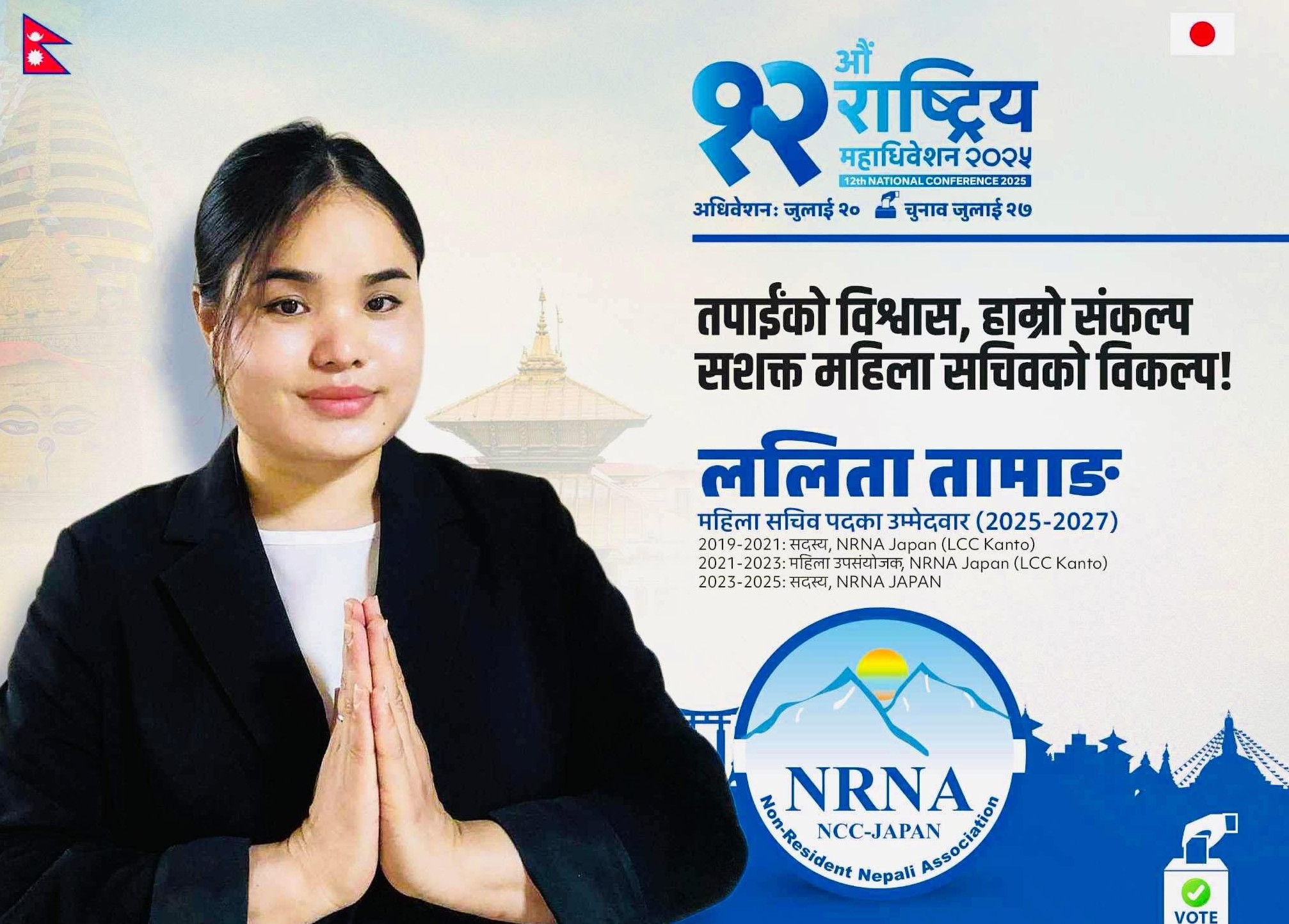 जापान । गैरआवासीय नेपाली संघ (एनआरएनए) जापानको आगामी २०२५-०२७ कार्यकालका लागि महिला सचिवमा ललिता तामाङले उम्मेदवार दिने घोषणा गरेकी छन ।