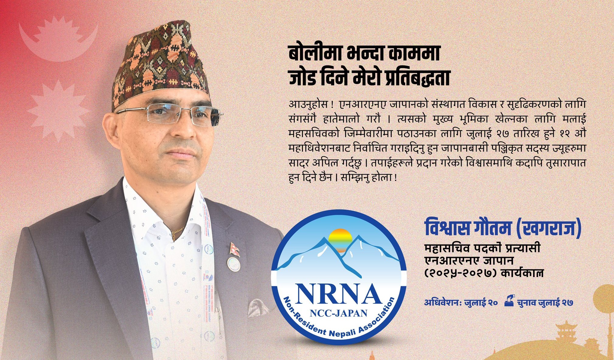 टोकियो । गैरआवासीय नेपाली संघ (एनआरएनए) जापानको महासचिव पदमा वरिष्ठ पत्रकार तथा समाजसेवी खगराज गौतम (विश्वास) ले उम्मेदवारी दिएका छन्।