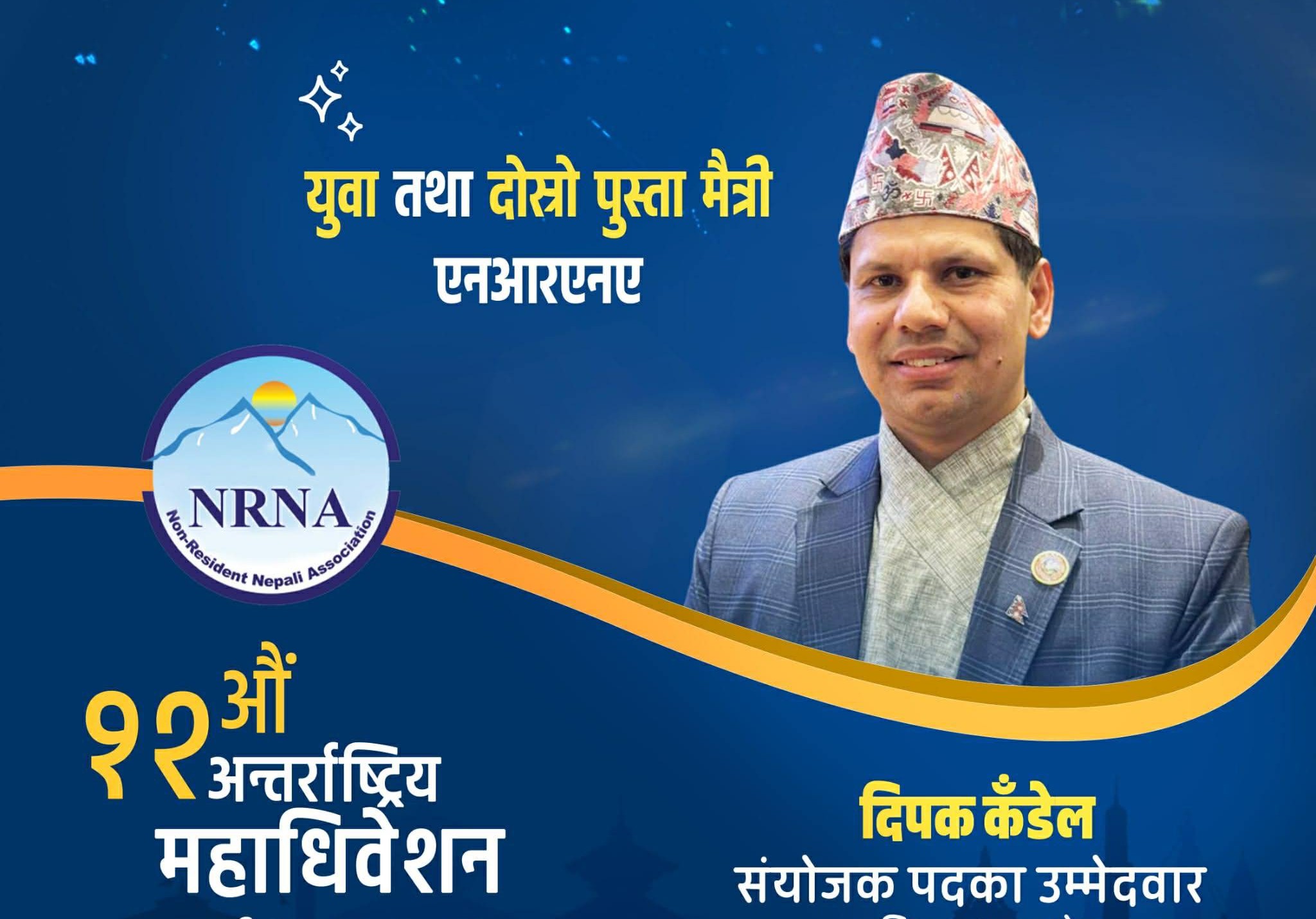 जापान । जापान । गैरआवासीय नेपाली संघ (NRNA) को १२औँ अन्तर्राष्ट्रिय महाधिवेशनमा एशिया प्रशान्त क्षेत्रीय संयोजक (RC) पदका जापानबाट दिपक कँडेलले उम्मेदवारी दिने घोषणा गरेका छन् ।