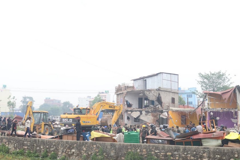 सरकारको निर्देशनअनुसार संरचना हटाउन नेपाल प्रहरी, सशस्त्र प्रहरी बल तथा काठमाडौँ महानगर प्रहरीको संयुक्त टोलीले शनिबार दिनभरि प्रभावित बासिन्दा र सरसामान सुरक्षित रूपमा सार्न सहयोग गरेको थियो । त्यसपछि मात्र डोजर प्रयोग गरी संरचना हटाउने काम गरिएको थियो ।