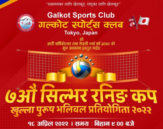 जापान । गलकोट स्पोर्ट्स क्लब जापानले आफ़नो आठौ वार्षिकोत्सवको अवसरमा सातौ सिल्भर रनिङ कप खुल्ला पुरुष भलिबल प्रतियोगिता २०२२ गर्ने भएको छ ।स्वास्थ्यका लागि खेलकूद राष्ट्रका लागि खेलकूद भन्ने मान्यता ....