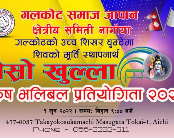 जापान । गत वर्ष जस्तै यस वर्ष पनि जापानको नागोयामा खुल्ला नकाउट भलिवल प्रतियोगिता हुने भएको छ । गल्कोट समाज जापान, क्षेत्रिय समिति नागोयाले आयोजना गरेको उक्त प्रतियोगिता जुन १ ....